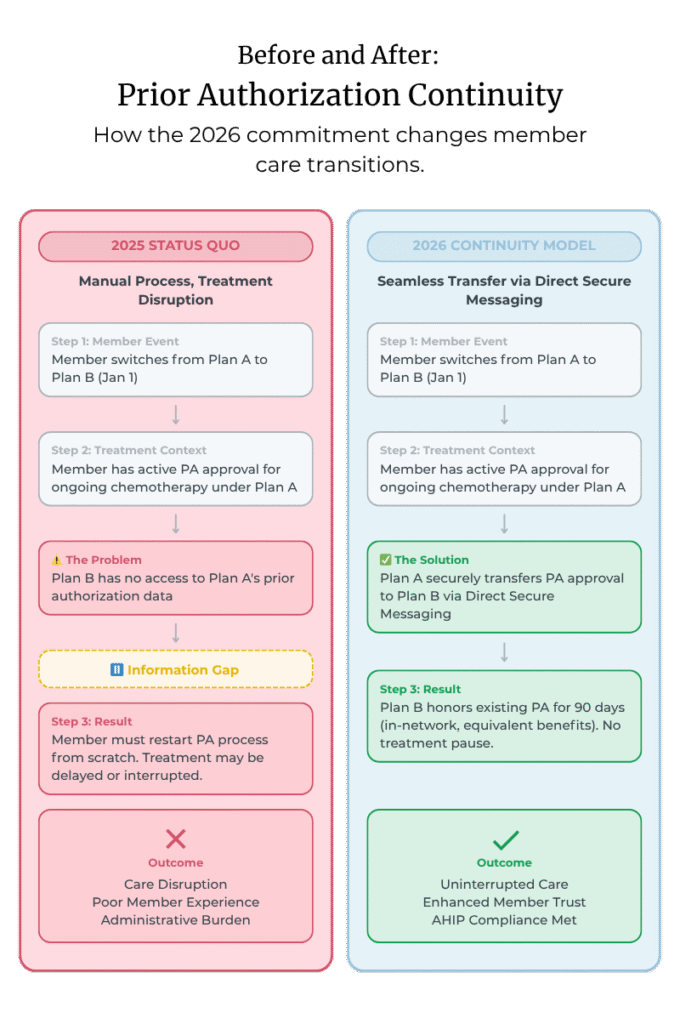 This concept is already familiar in Medicare Advantage and some Medicaid programs, and now it expands to commercial plans. The big question for payers is practical: What’s the most efficient way to exchange prior authorization information plan-to-plan—quickly, securely, and with minimal disruption?