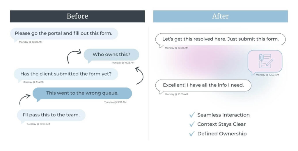 Instead of treating messaging, forms, and portals as separate moments, they design them as parts of a single, continuous interaction. Customers stay oriented. Context carries forward. Internal teams don’t have to reconcile disconnected systems after the fact.